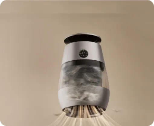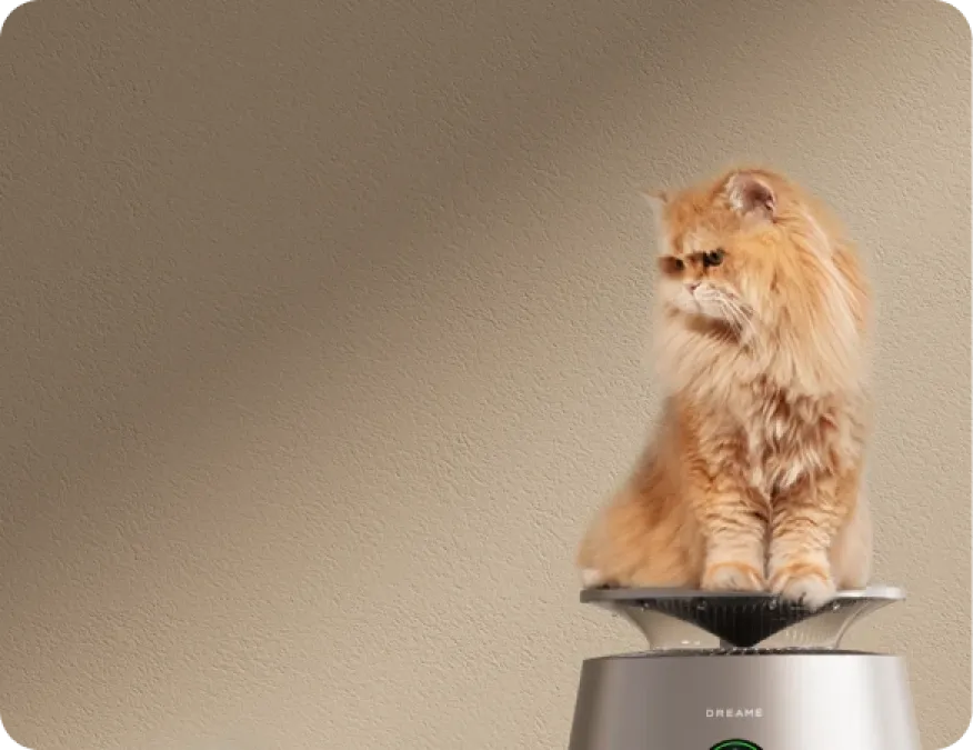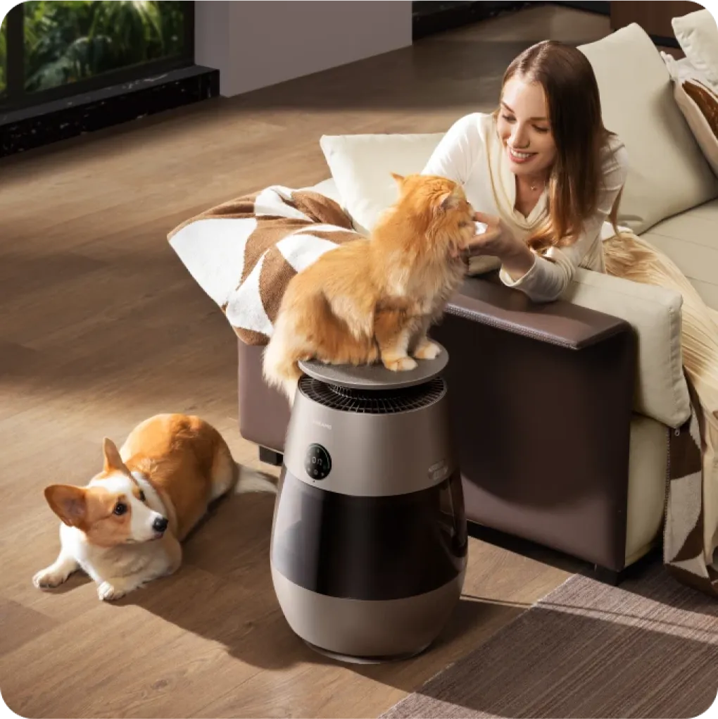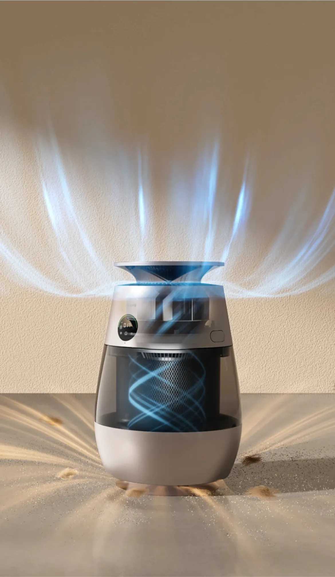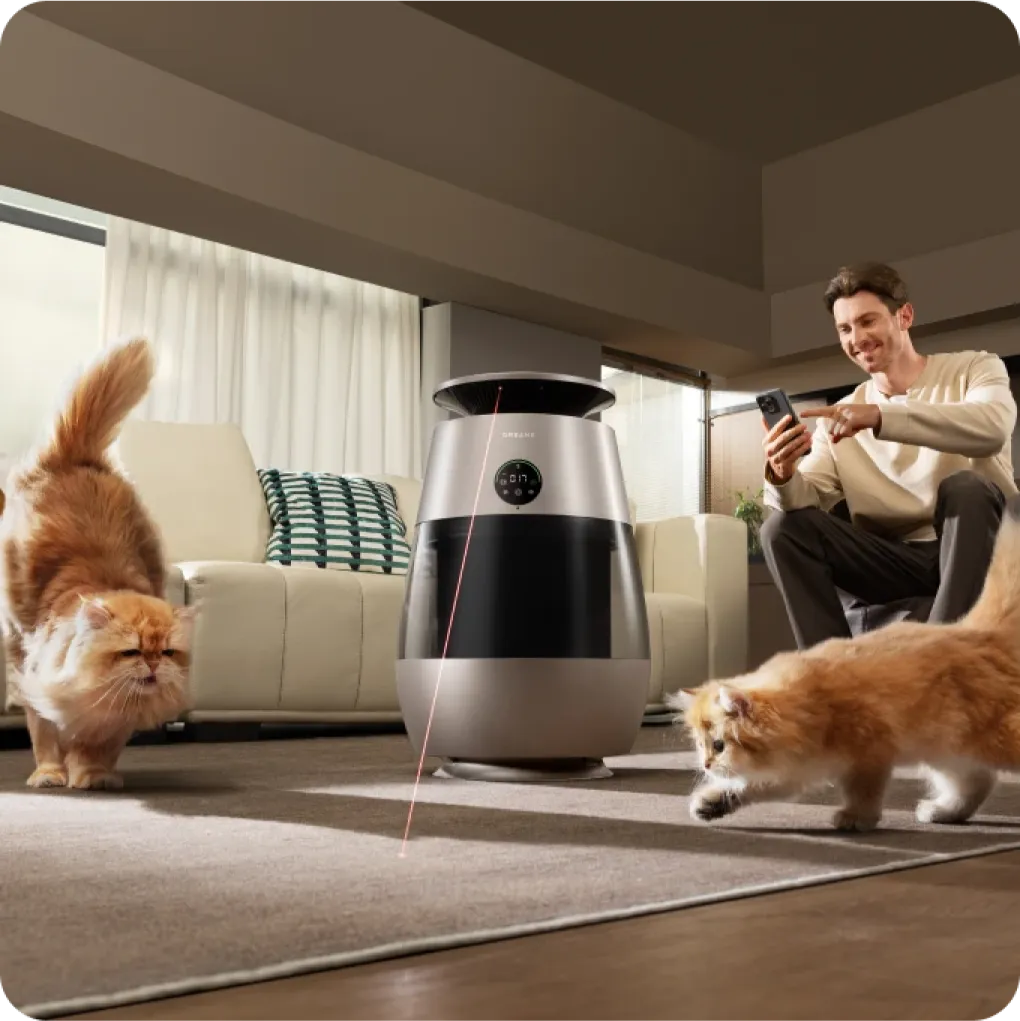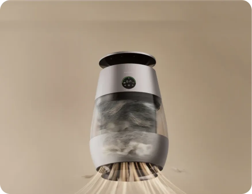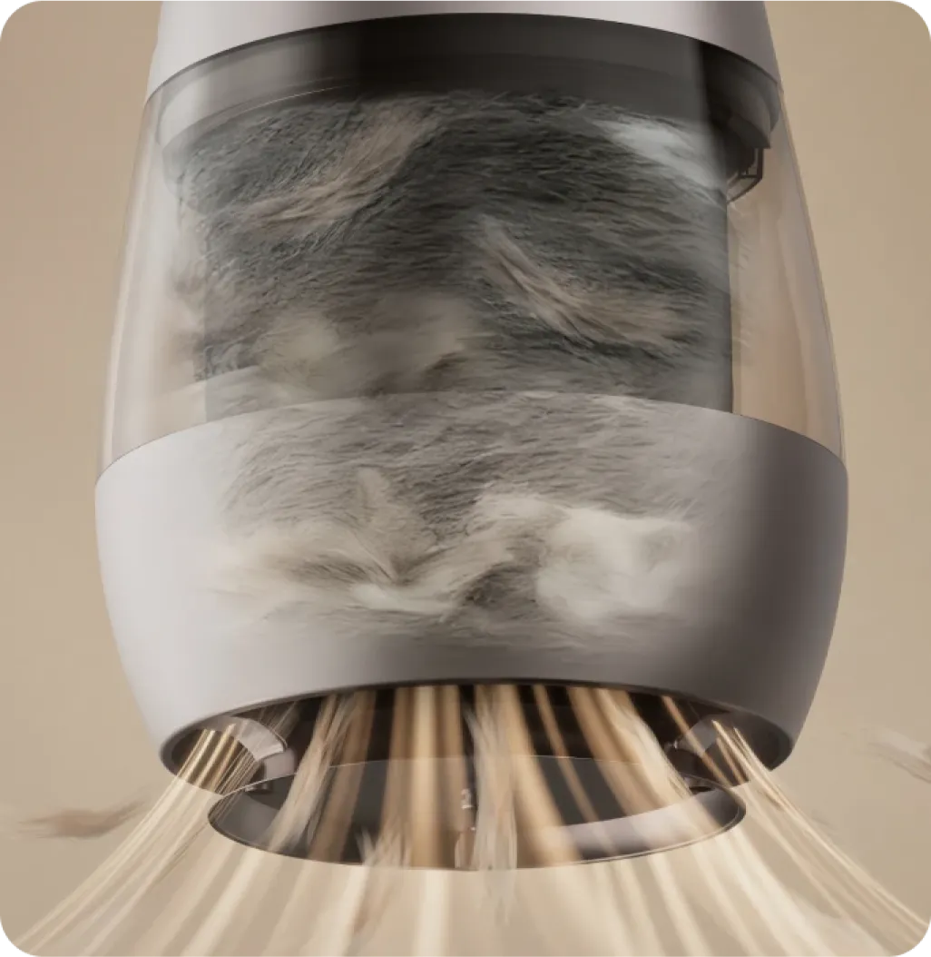 Con características de captura del pelo a larga distancia*, recogida automática, limpieza potente y circulación de alta frecuencia, puede atrapar rápidamente el pelo flotante de los gatos con sus enérgicos juegos o el que mudan a diario, para alcanzar un 99,9 % de eliminación eficiente del pelo flotante y las bolas que se forman debajo los muebles y entre los huecos del sofá