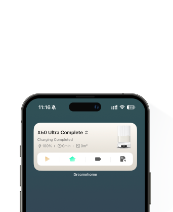 La batería de 6400 mAh de X50 Ultra Complete ofrece hasta 220 minutos* de limpieza en modo silencioso, con una cobertura de hasta 205 m²* en una sola carga. Cuando la batería se está agotando, vuelve a la base para recargarse y continúa limpiando desde donde lo dejó. Disfruta de una carga un 30 % más rápida* y de la opción de carga en horas de menor actividad.