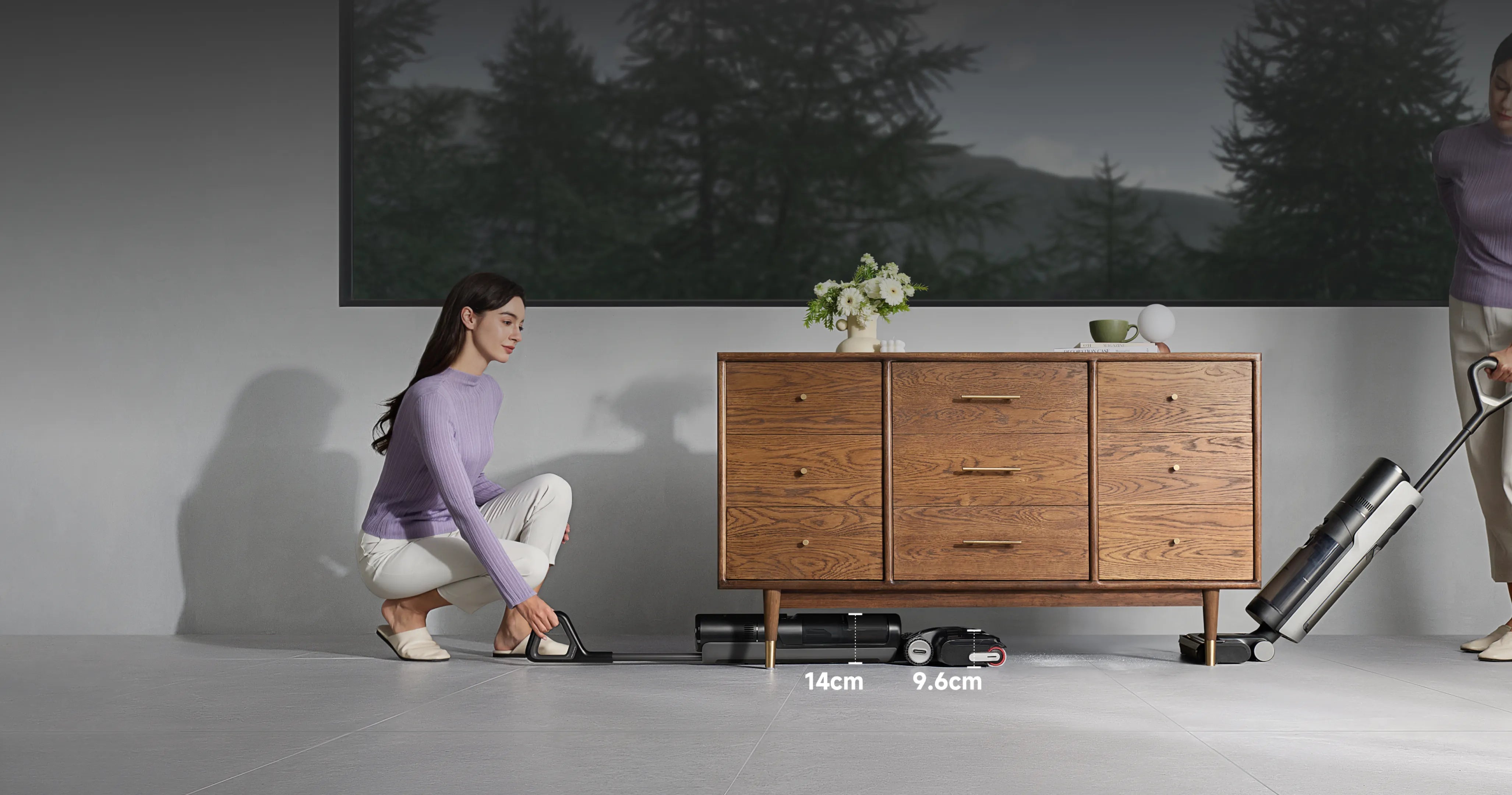 *180°, 14 cm, 9,6 cm: El cuerpo completo del aspirador puede llegar a espacios de tan solo 14 cm de altura y el cabezal del cepillo a espacios de tan solo 9,6 cm de altura. Según datos de nuestro laboratorio interno.