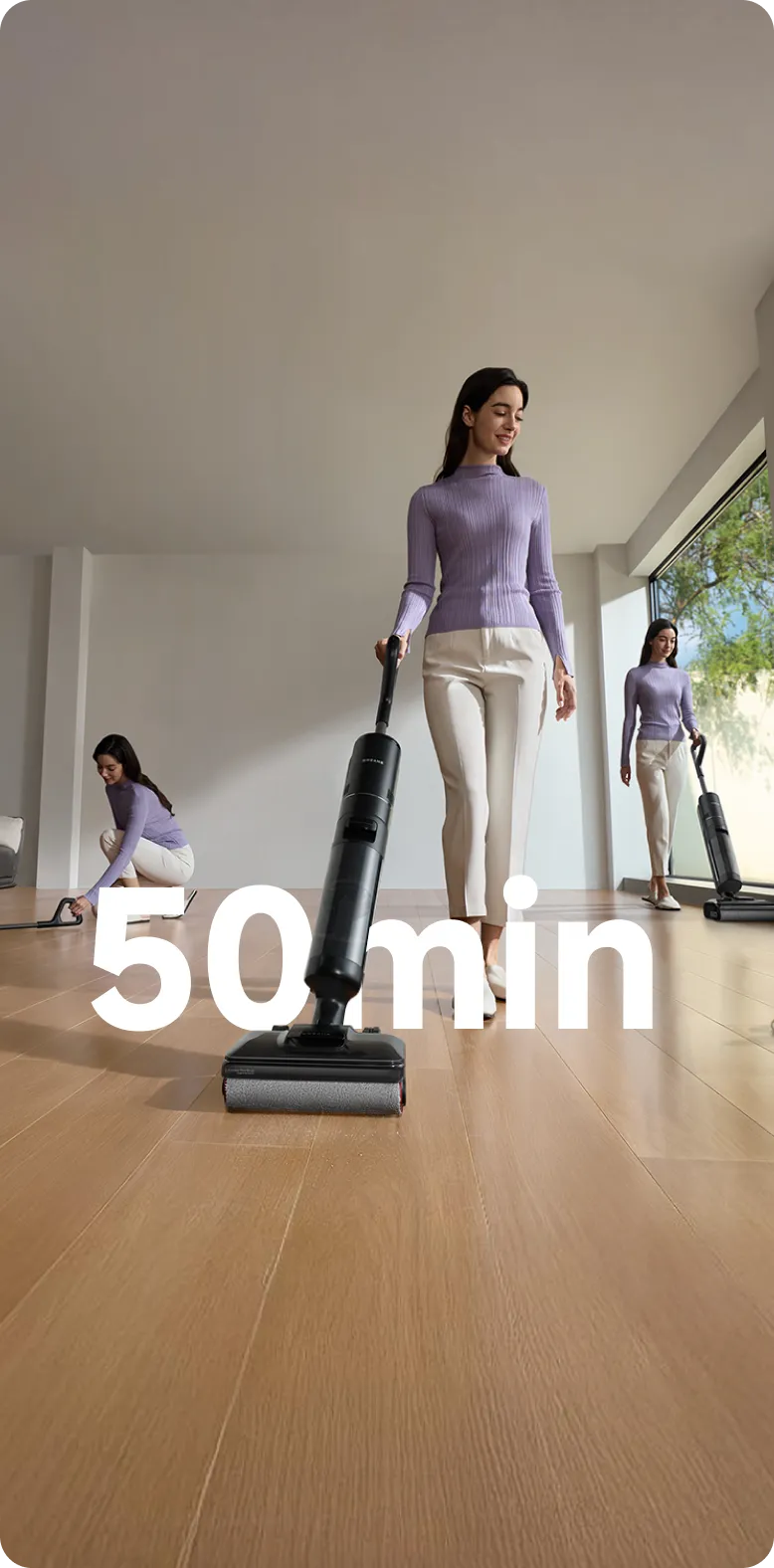 *50 min y 300 m²: Según datos de nuestro laboratorio interno, utilizando el modo Silencioso. El tiempo de funcionamiento real puede variar.