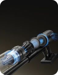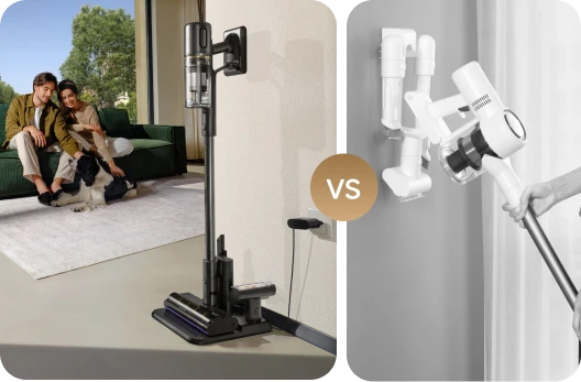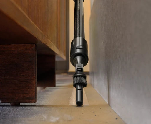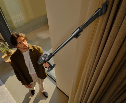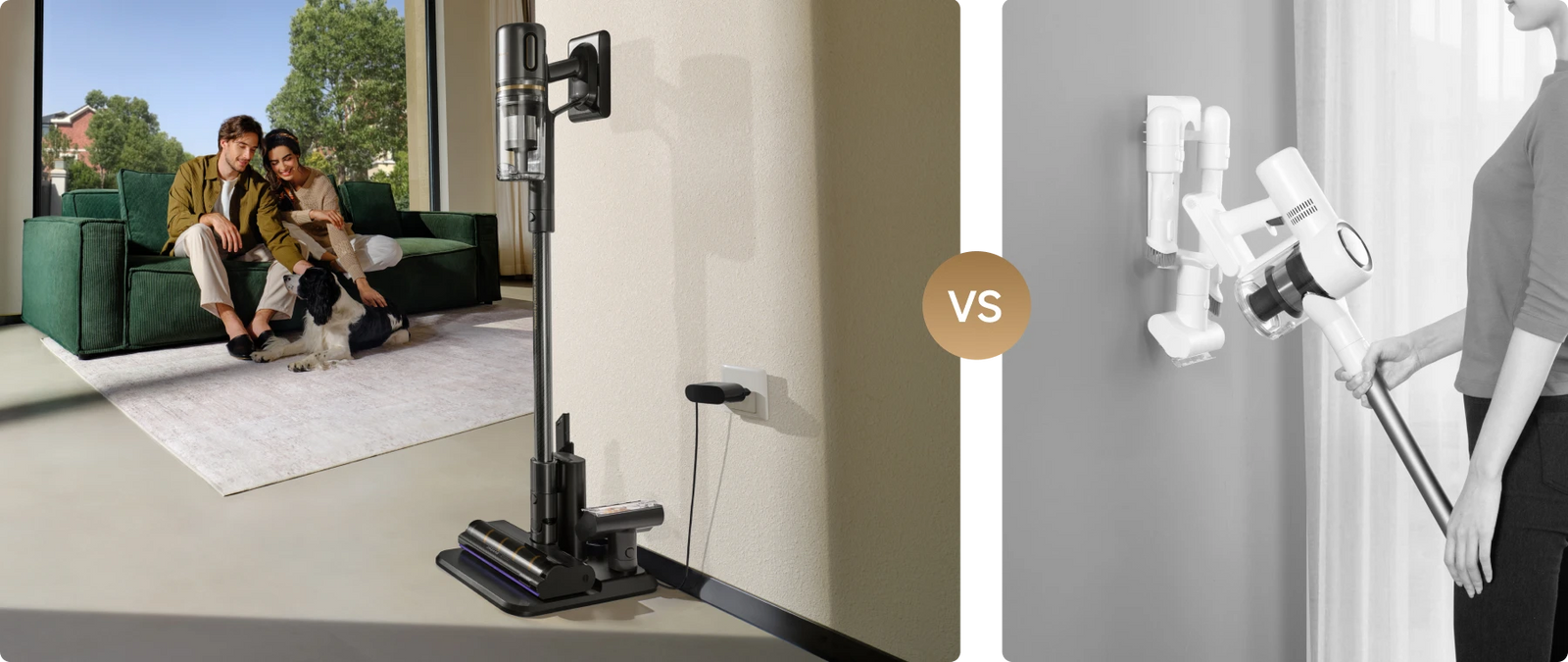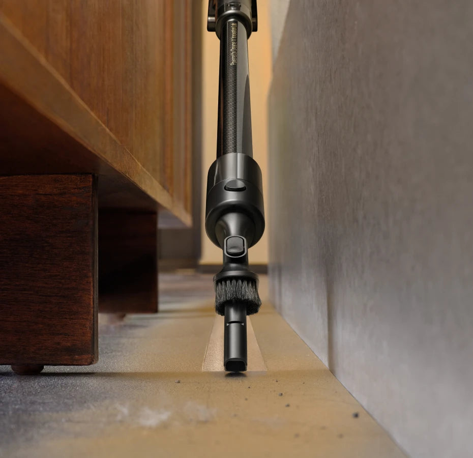 V20 se carga mientras está almacenado, garantizando que esté listo para usarse. La aspiradora y los accesorios se guardan de manera segura en la base para fácil acceso y organización.