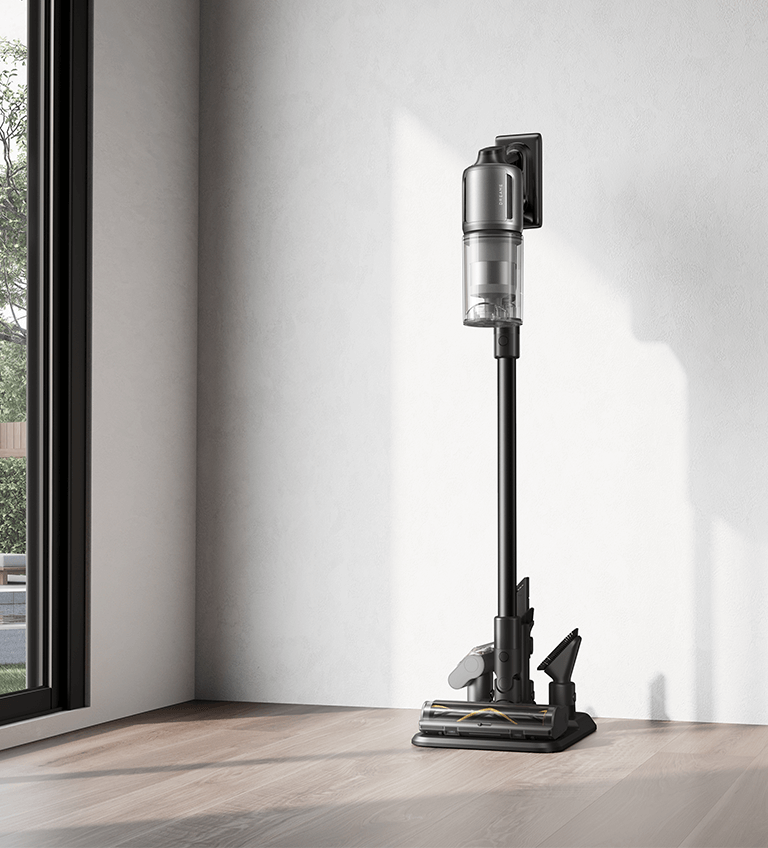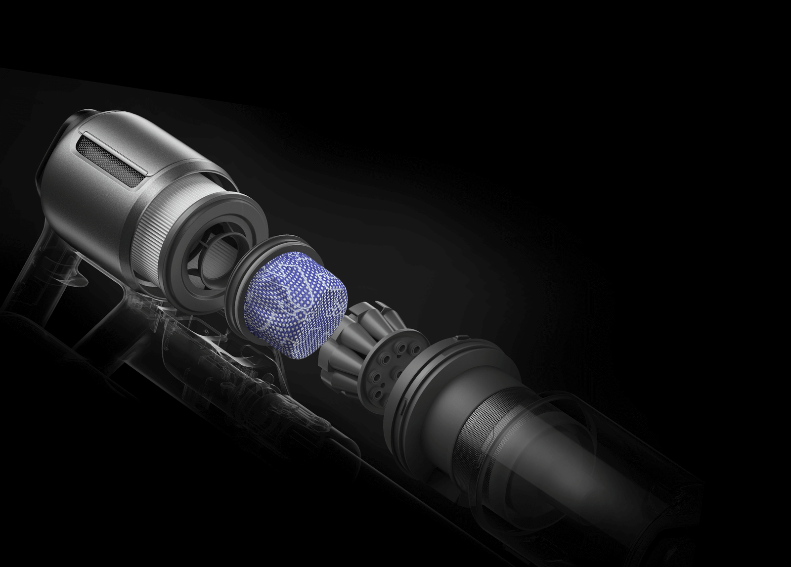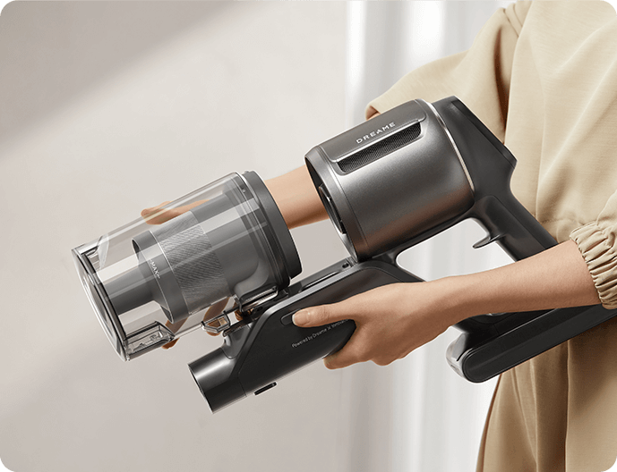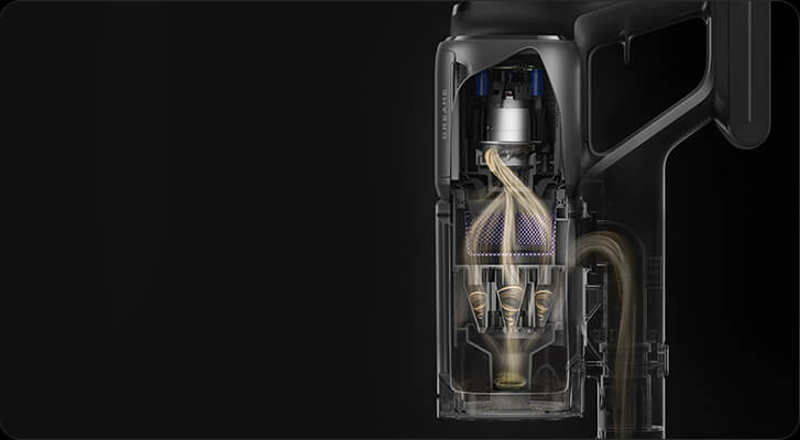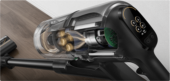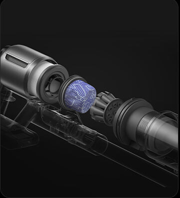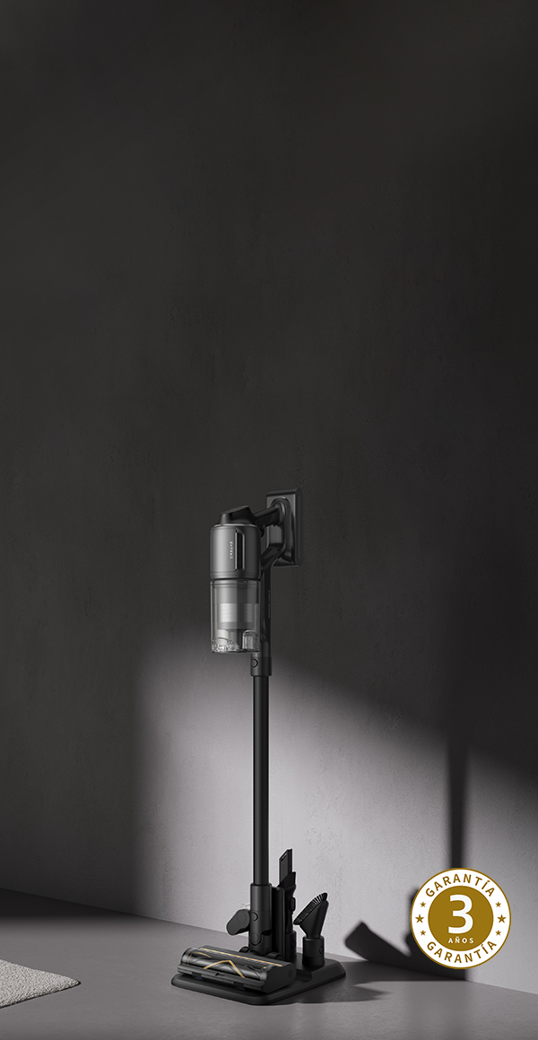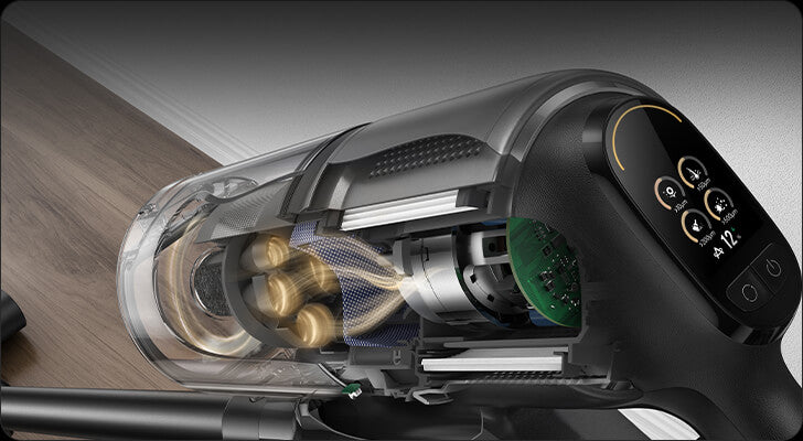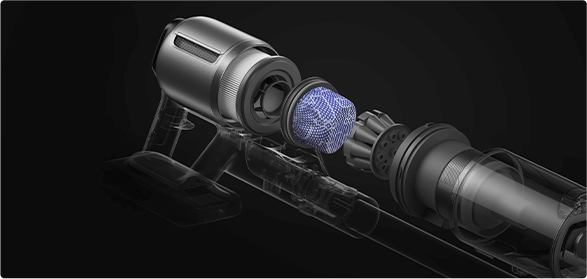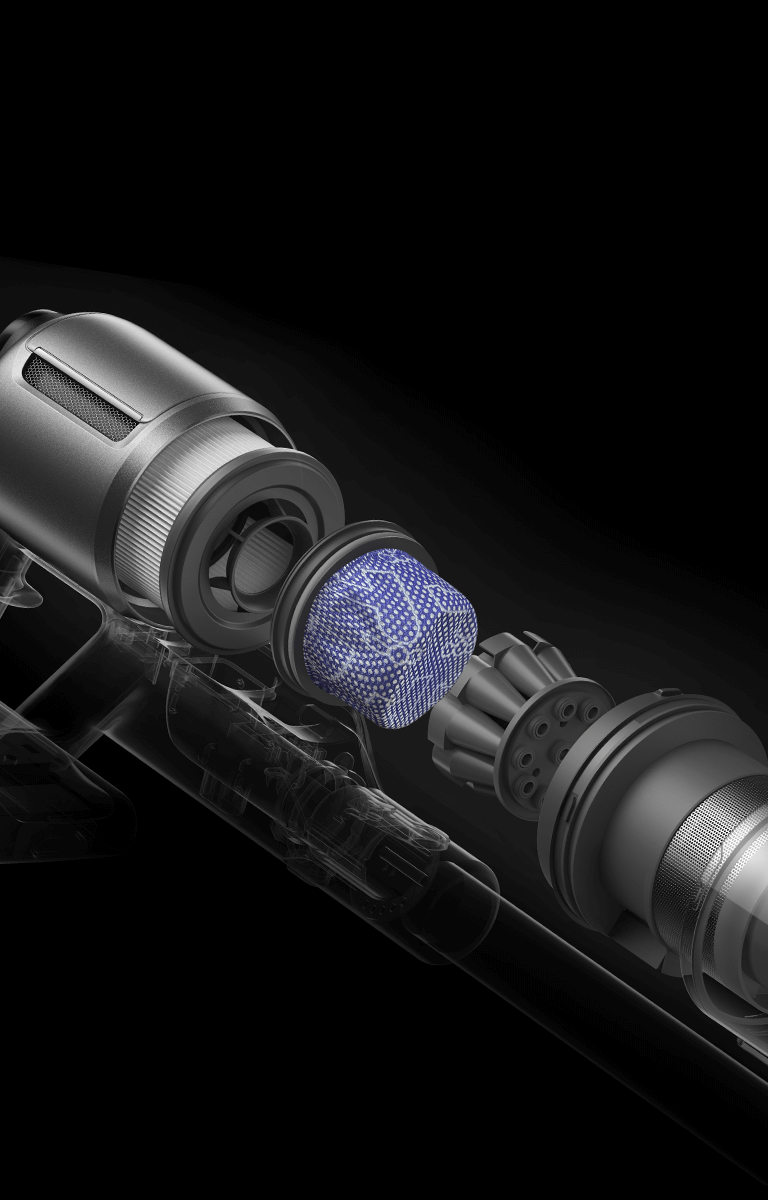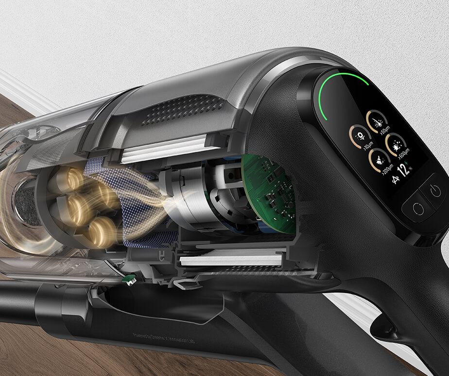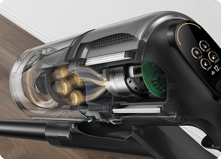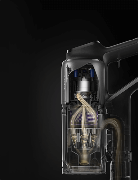 *310 AW, 150 000 r. p. m.: basado en los datos obtenidos del laboratorio de Dreame, las prestaciones reales pueden variar. Hasta mayo de 2024, la potencia de succión de 310 AW representa el valor más alto dentro de la línea de aspiradoras escoba inalámbricas de Dreame.