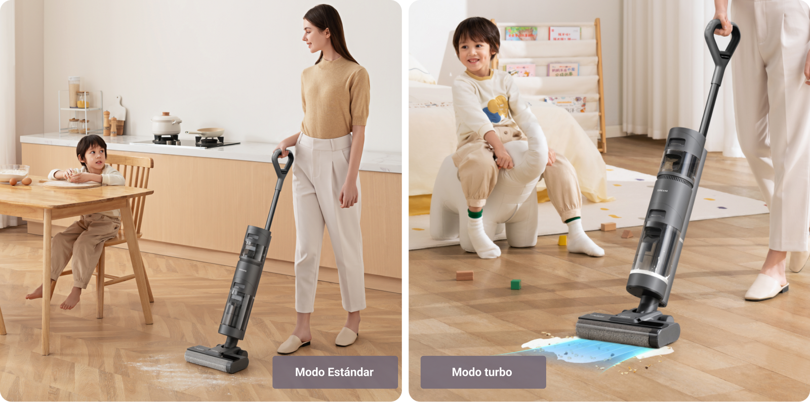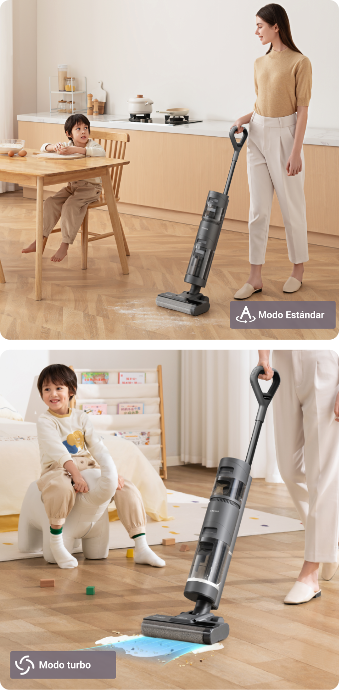 Proporcionamos dos modos para personalizar tus necesidades de limpieza. Gracias al modo Estándar, para una limpieza básica, y el modo Turbo, para una limpieza en profundidad, podrás encargarte fácilmente tanto de la suciedad húmeda como de la seca.