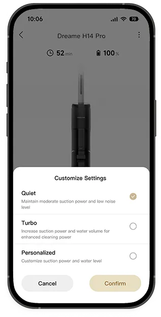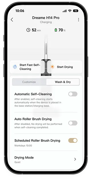 Además de la dispensación automática de solución, este aspirador cuenta con otro sensor inteligente que adapta automáticamente la potencia en función de la cantidad de suciedad que encuentre. Tanto si se trata de pelo de mascotas o migas, el H14 Pro ofrece un rendimiento satisfactorio a la vez que maximiza la eficiencia energética.