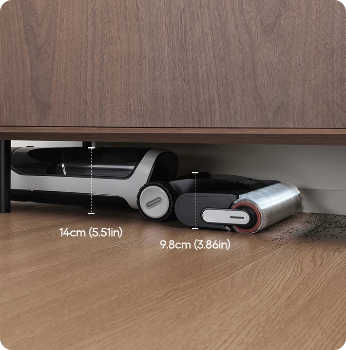 ¹180°, 14 cm, 9,8 cm: el cuerpo completo del aspirador puede llegar a espacios de tan solo 14 cm, y el cabezal de cepillado de tan solo 9,8 cm, según los datos de pruebas del laboratorio de Dreame.
