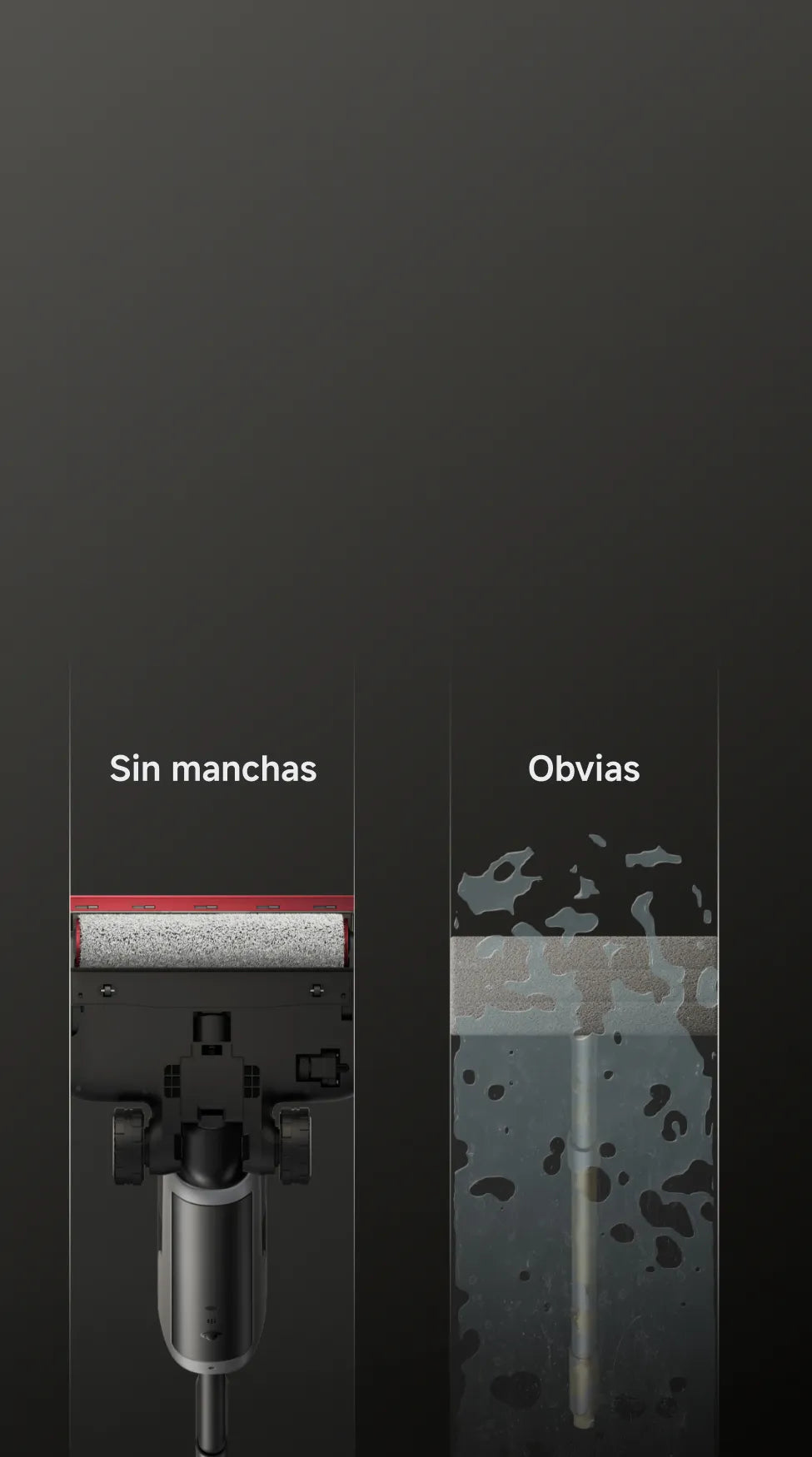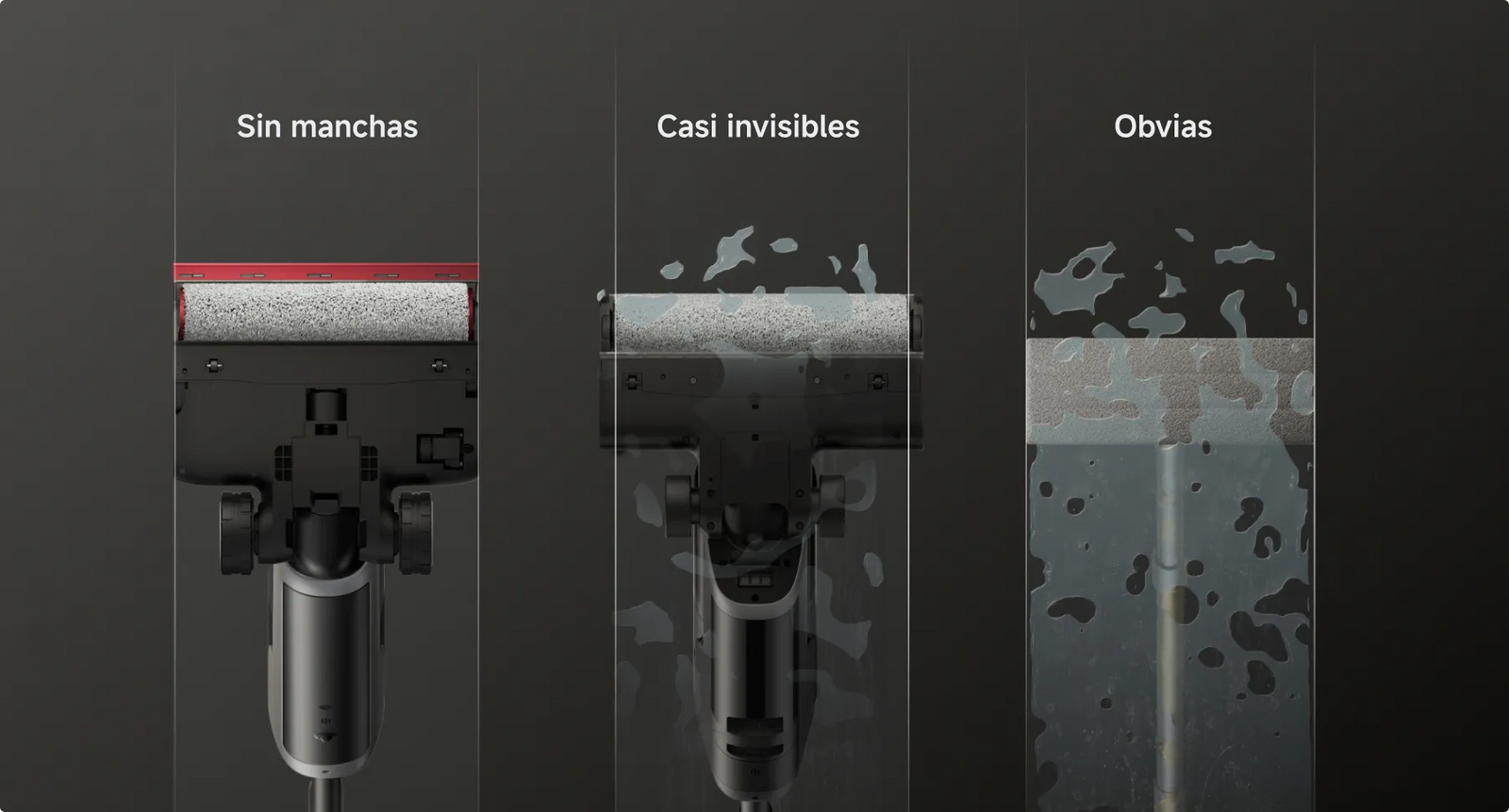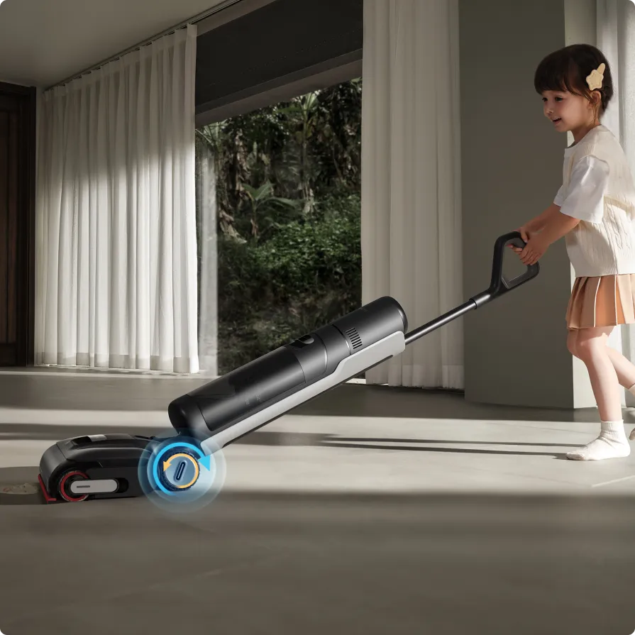 Las dos ruedas traseras emplean algoritmos inteligentes para garantizar que el movimiento hacia atrás sea tan fluido como el movimiento hacia delante. Se mueve fácilmente adelante y atrás para que la limpieza del suelo pase de ser una tarea agotadora físicamente a una actividad divertida cuando vuelves a casa.