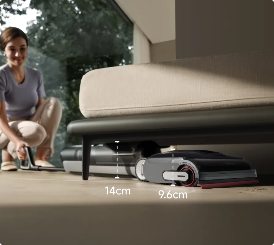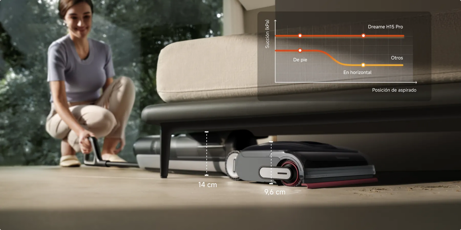 *180°, 14 cm, 9,6 cm: el cuerpo completo del aspirador puede llegar a espacios de tan solo 14 cm de altura, mientras que el cabezal llega a espacios de tan solo 9,6 cm de altura.