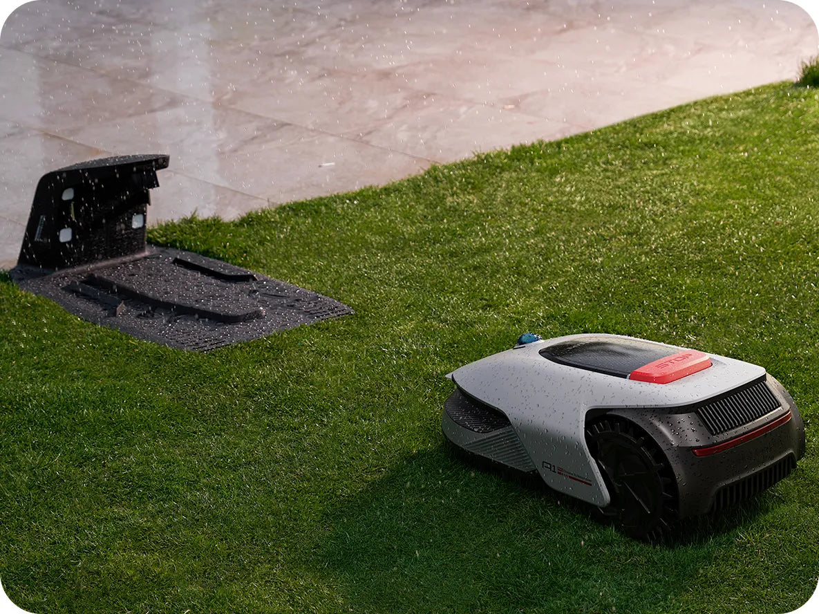 Al detectar lluvia, A1 Pro vuelve automáticamente a la estación de carga y reanuda la tarea de corte interrumpida cuando deja de llover.