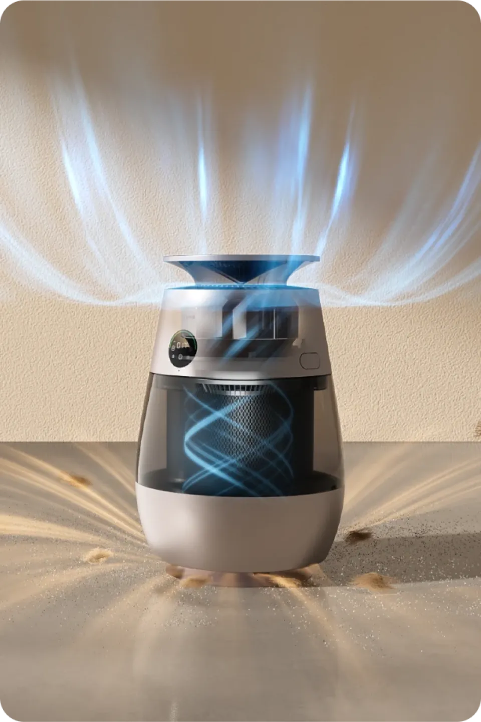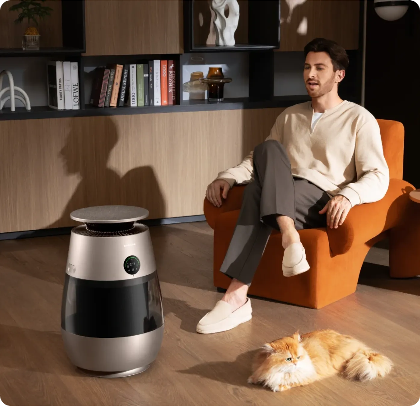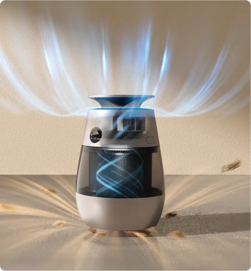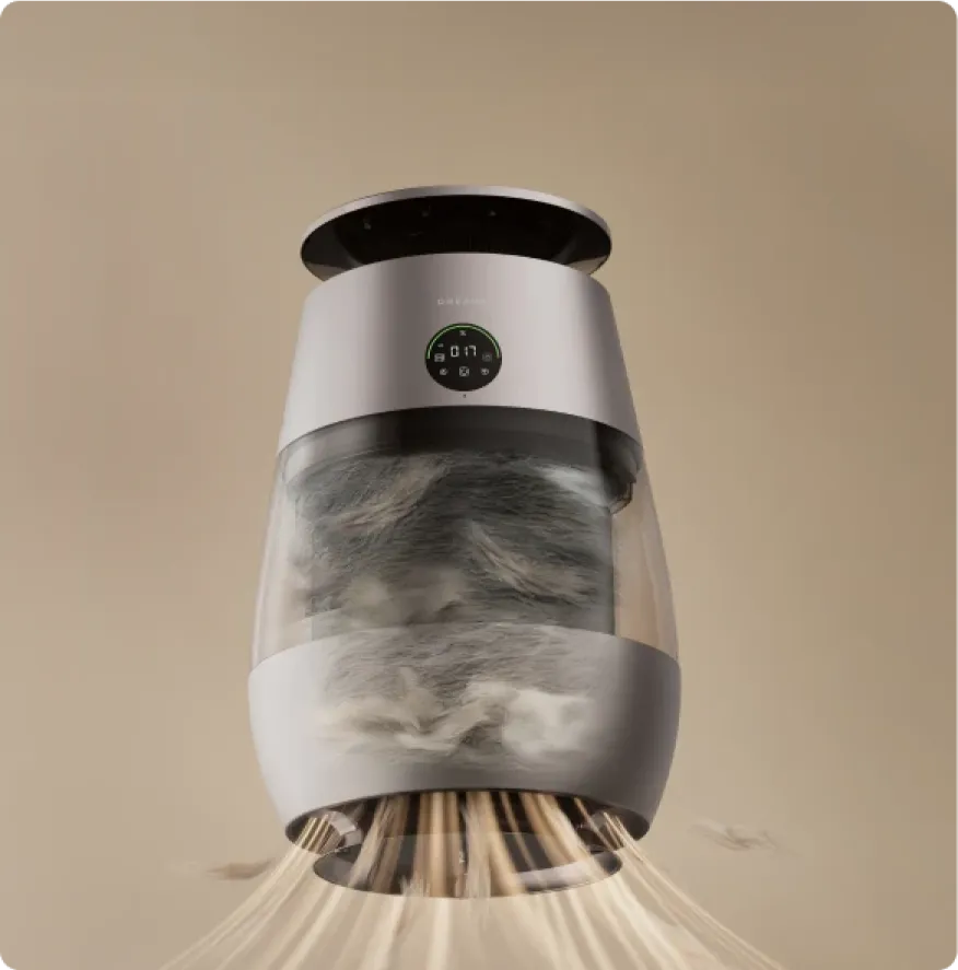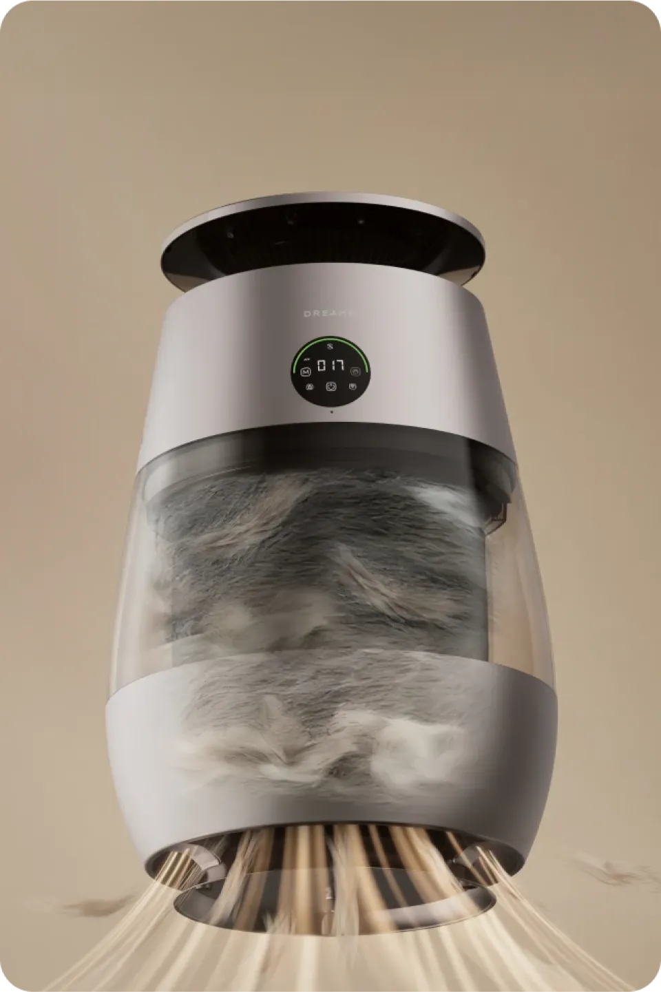 *99.9%: The experiment was conducted in a third-party laboratory. The prototype unit was placed in a 3m³ test chamber and set to pet mode. During testing, it was observed that after the unit was turned on, pet hair was captured onto the filter, with a capture rate of 99.9%. Data tested by third-party laboratory.Report No.FZCS-250905LW-01;