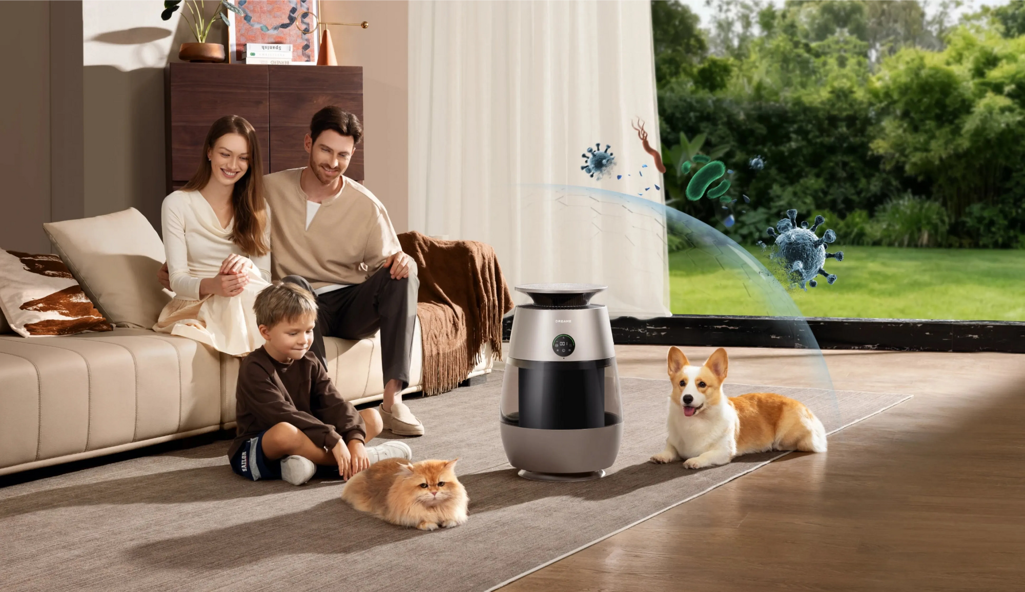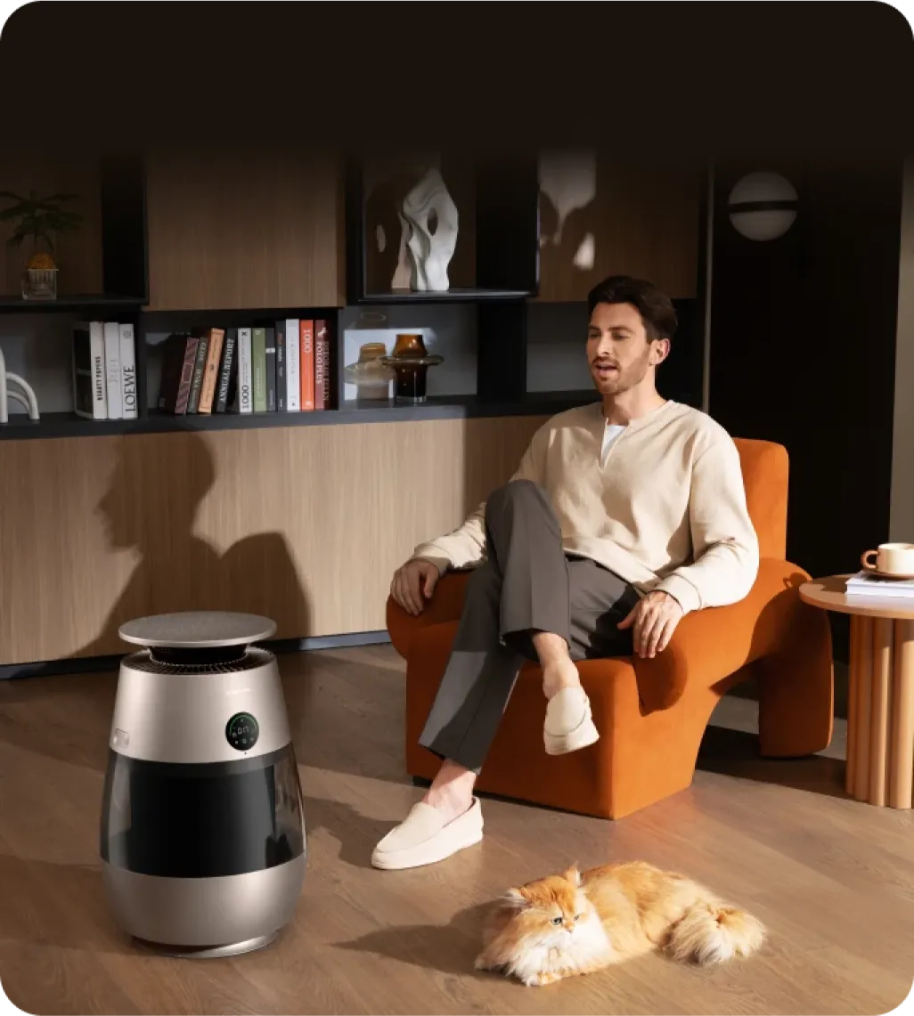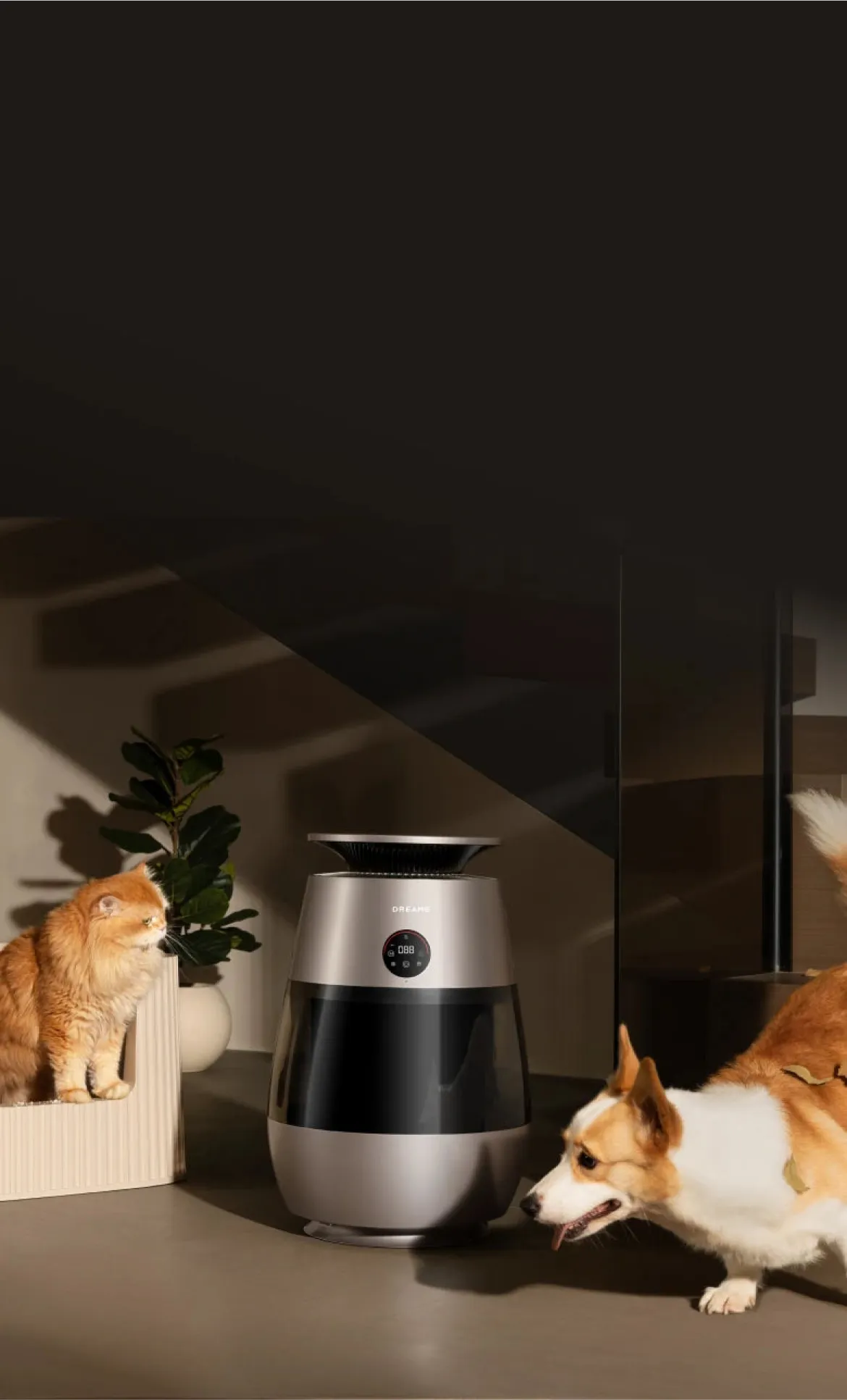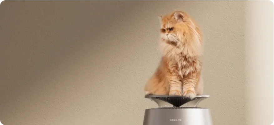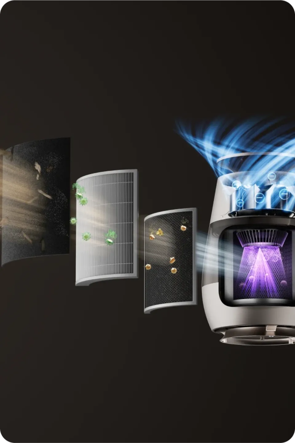 *99.9%: The experiment was conducted in a third-party laboratory. The prototype unit was placed in a 3m³ test chamber and set to pet mode. During testing, it was observed that after the unit was turned on, pet hair was captured onto the filter, with a capture rate of 99.9%. Data tested by third-party laboratory.Report No.FZCS-250905LW-01;
