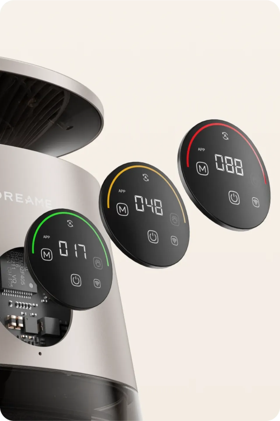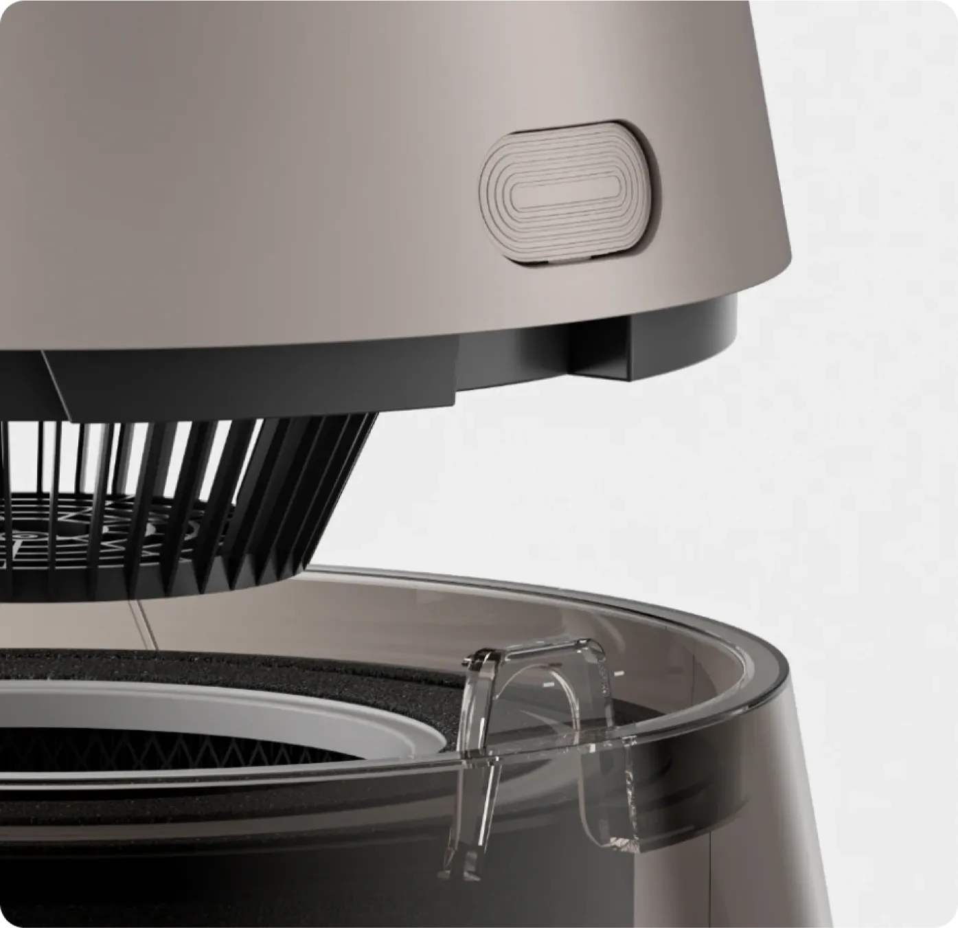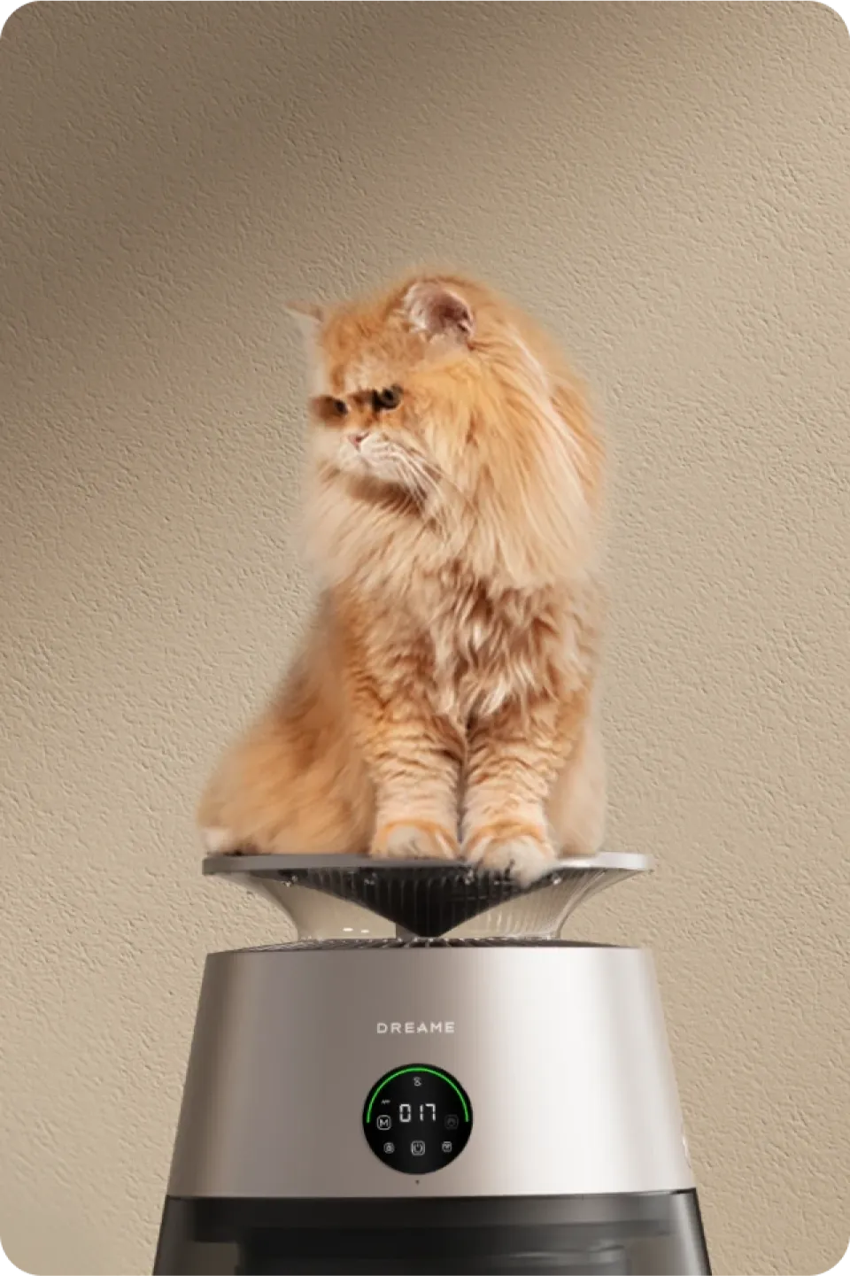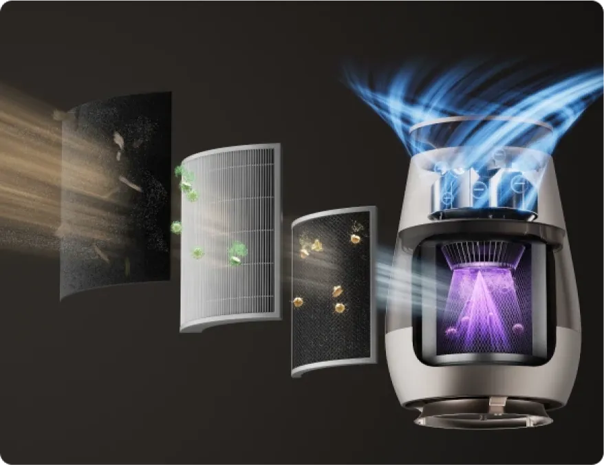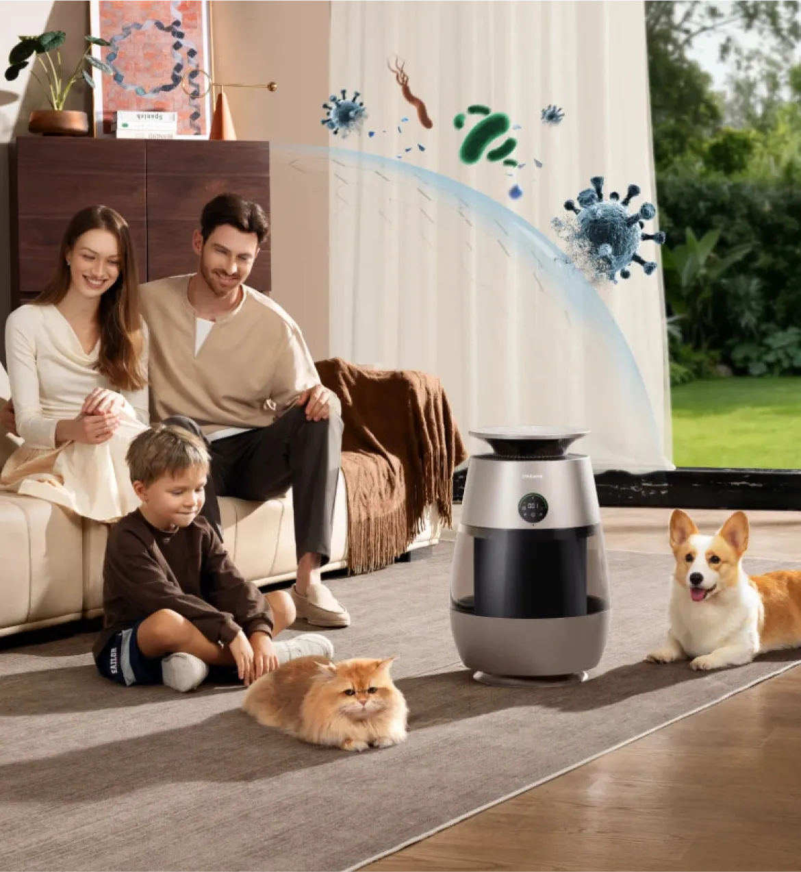 *99.9%: The experiment was conducted in a third-party laboratory. The prototype unit was placed in a 3m³ test chamber and set to pet mode. During testing, it was observed that after the unit was turned on, pet hair was captured onto the filter, with a capture rate of 99.9%. Data tested by third-party laboratory.Report No.FZCS-250905LW-01;