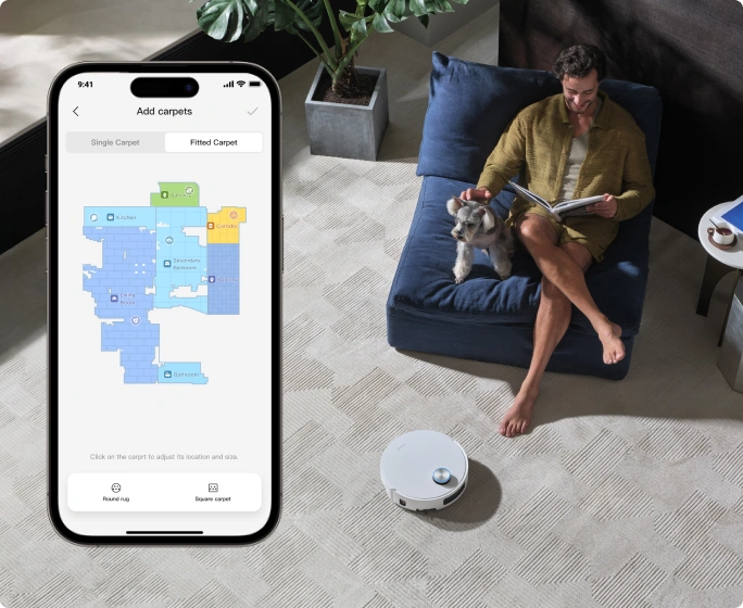 *La función no es recomendable para alfombras de una altura superior a 3 cm, ya que las alfombras más altas tienen el riesgo de humedecerse. La configuración de limpieza de alfombras de pelo medio o largo debe activarse manualmente en la app de limpieza.