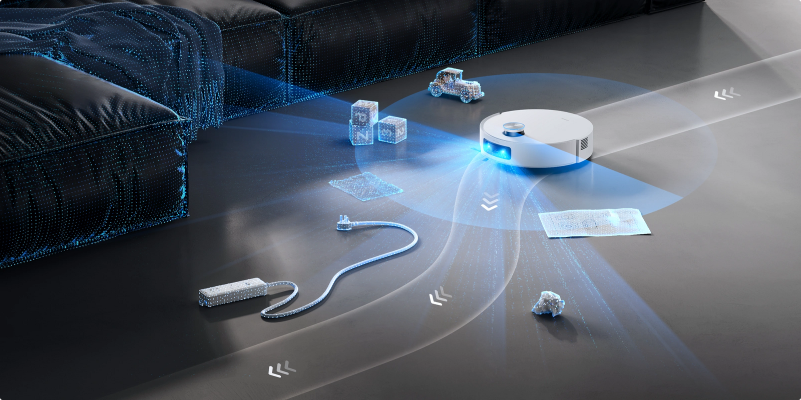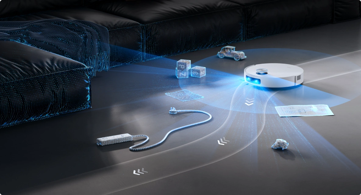 La tecnología de esquivación de obstáculos StereoEdge™ del aspirador usa la luz estructurada 3D para esquivar fácilmente cables desperdigados por el suelo o muebles de forma irregular, utilizando datos de nube de puntos láser para identificar obstáculos a hasta 10 cm* de distancia, lo que reduce los puntos ciegos.