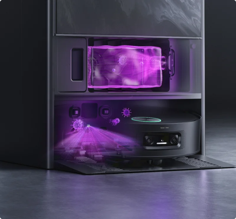 Las luces UV en la abertura de la bolsa de polvo y por encima de la placa de lavado reducen aún más las bacterias*.