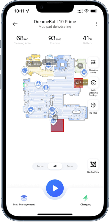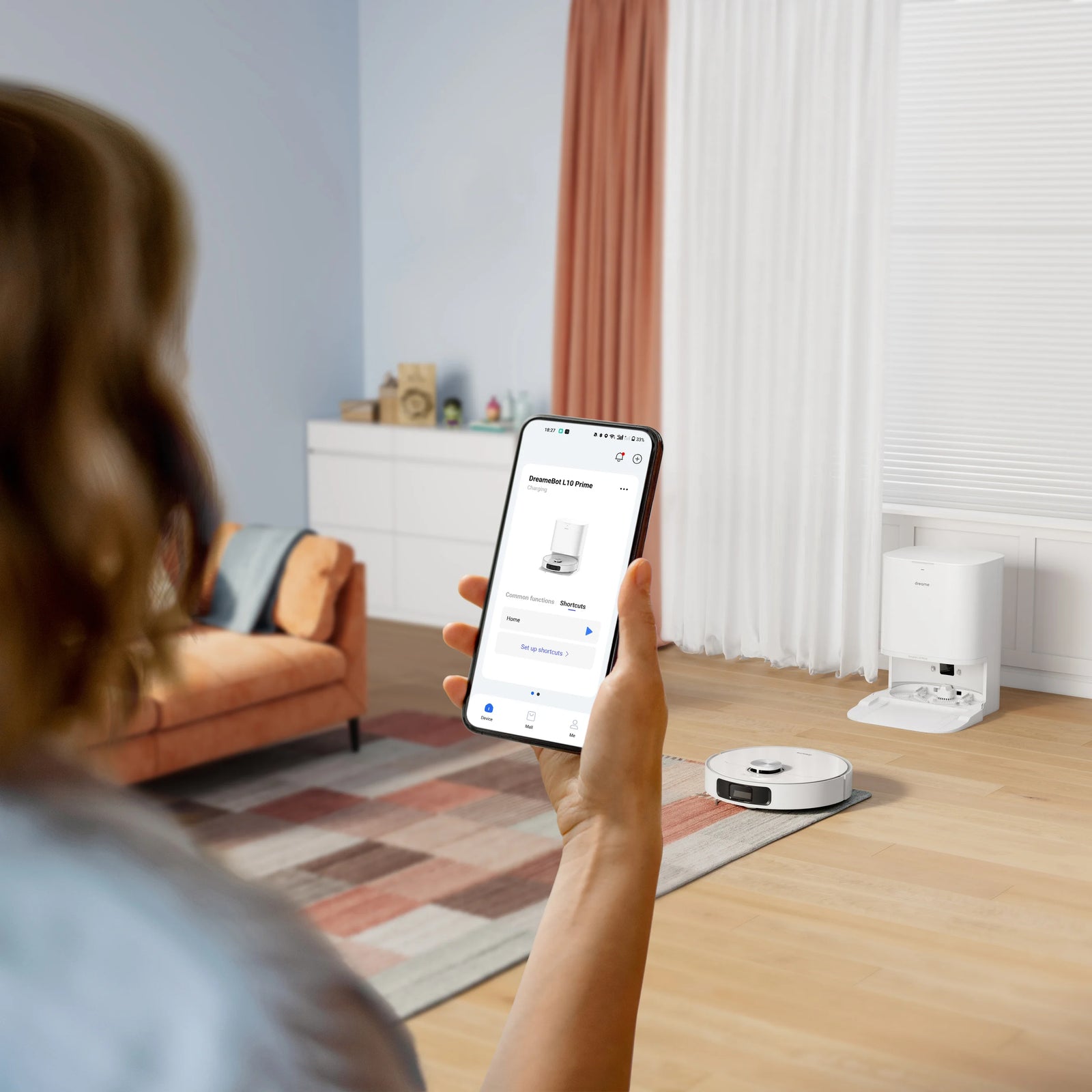 Consigue unas mopas limpias y secas después de cada sesión de limpieza. L10 Prime vuelve automáticamente a la estación base durante la limpieza para lavar las mopas en la placa base extraíble antes de continuar con la limpieza. Una vez finalizada la limpieza, vuelve a lavar las mopas en la estación base y las seca con aire.