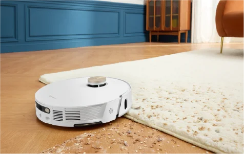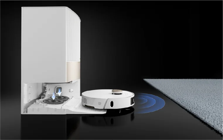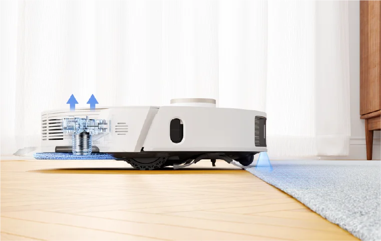 La detección ultrasónica avanzada de alfombras permite al robot L20 Ultra identificar las alfombras y volver a la estación base para desmontar las mopas cuando está configurado para hacerlo* y así mantenerlas en buen estado y secas.Al volver al modo de limpieza, la función de succión inteligente penetra profundamente en las alfombras para eliminar el polvo y los residuos incrustados.