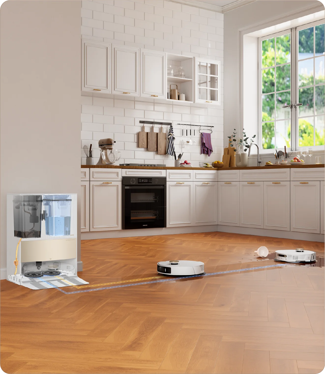 la estación base mezcla de forma autónoma la solución de limpieza con agua, lo que garantiza que las mopas permanezcan frescas y limpias sin esfuerzo manual.