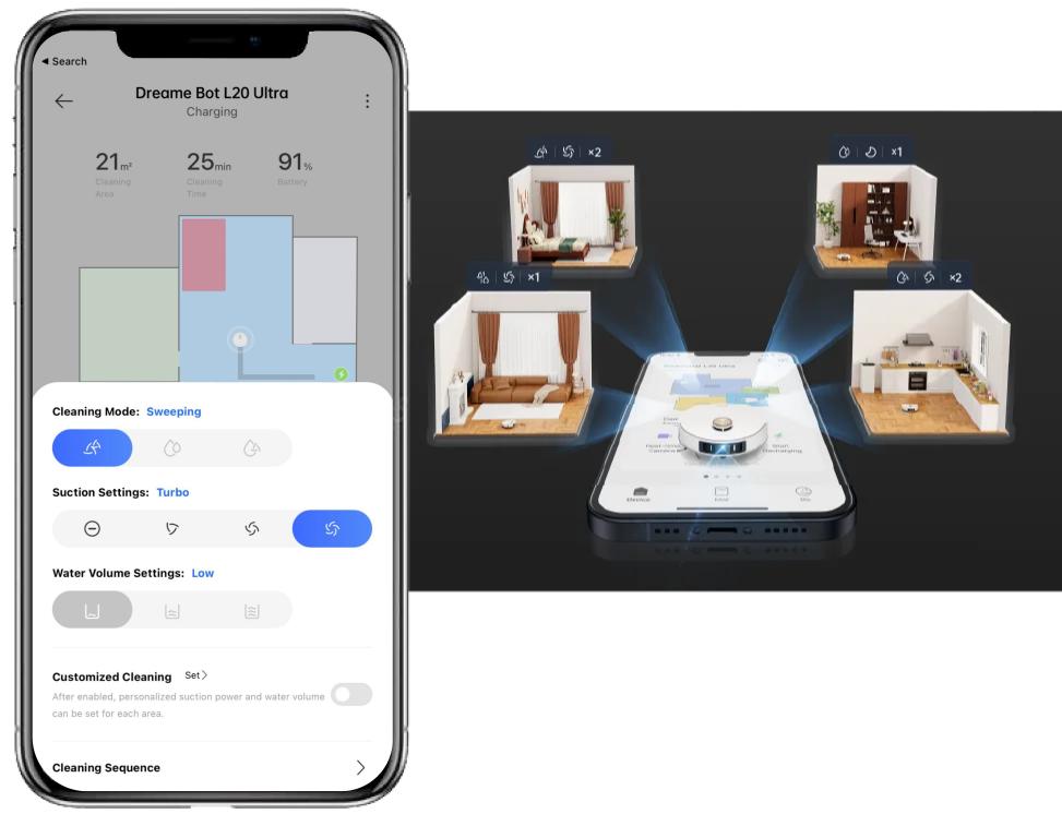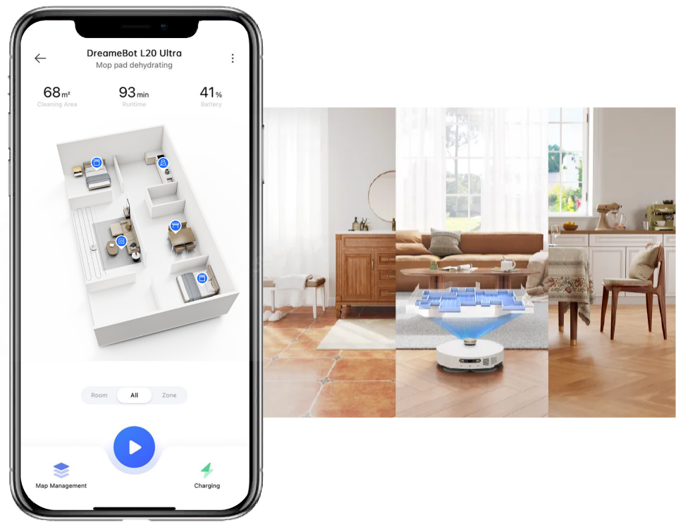 Descarga la nueva aplicación en App Store o Google Play para disfrutar de la mejor experiencia de Dreamehome.Toma el control a través de la aplicación para adaptar la limpieza a tu hogar y a tu horario.Segmenta habitaciones, crea paredes virtuales, establece zonas prohibidas y programa limpiezas, todo desde la comodidad de tu teléfono.
