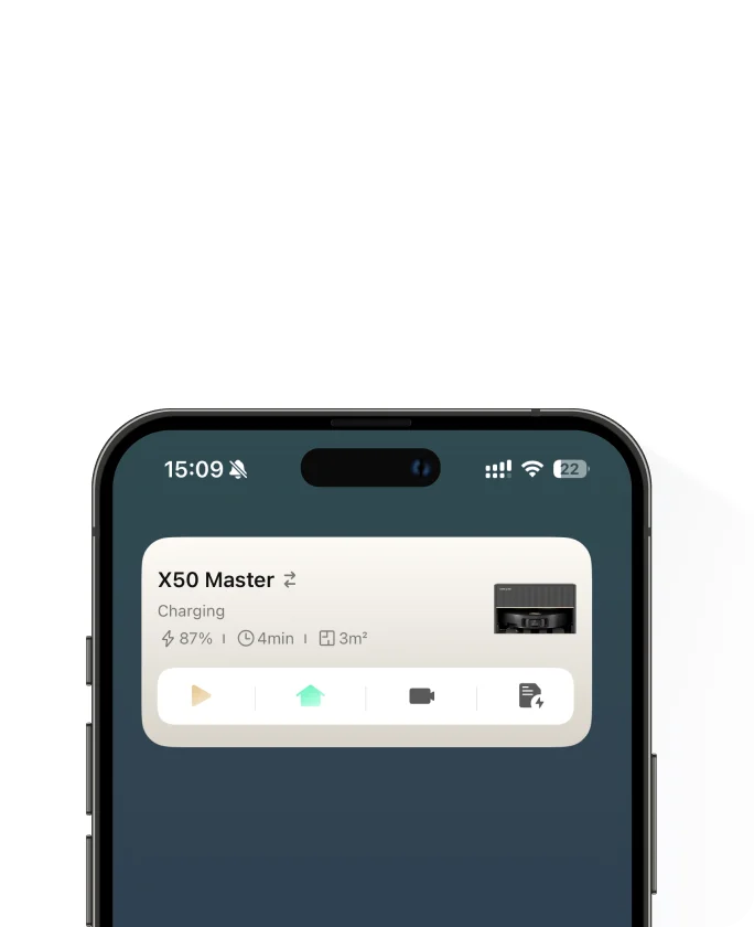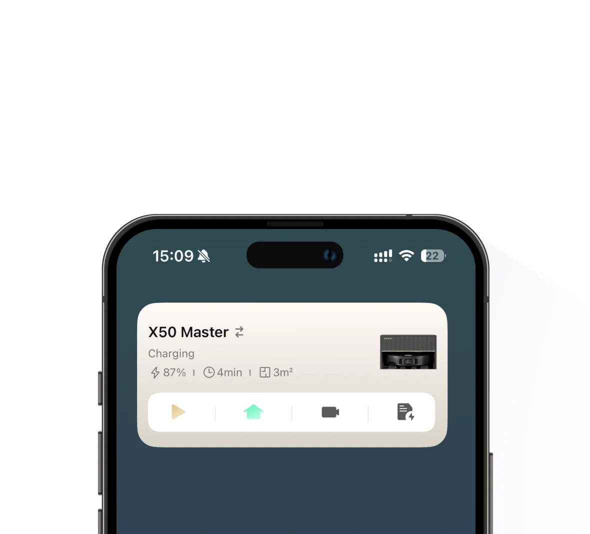 La batería de 6400 mAh de X50 Master ofrece hasta 220 minutos* de limpieza en modo silencioso, con una cobertura de hasta 205 m²* en una sola carga. Cuando la batería se está agotando, vuelve a la base para recargarse y continúa limpiando desde donde lo dejó. Disfruta de una carga un 30 % más rápida* y de la opción de carga en horas de menor actividad.