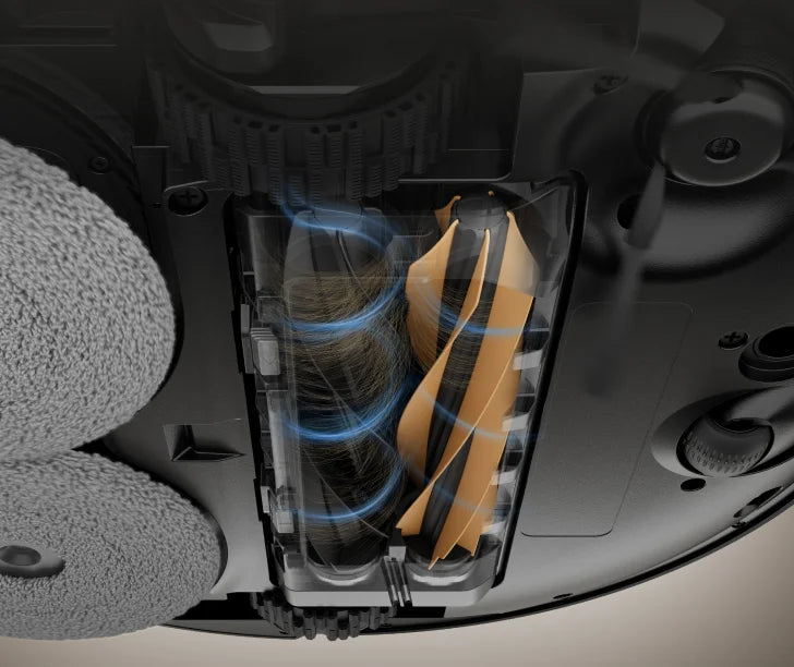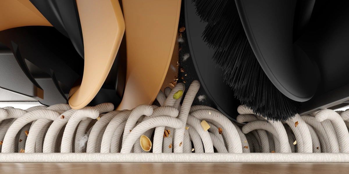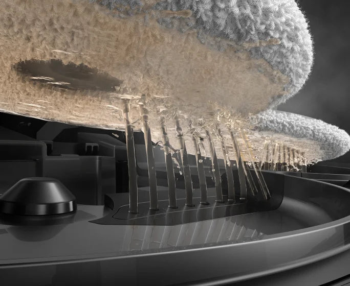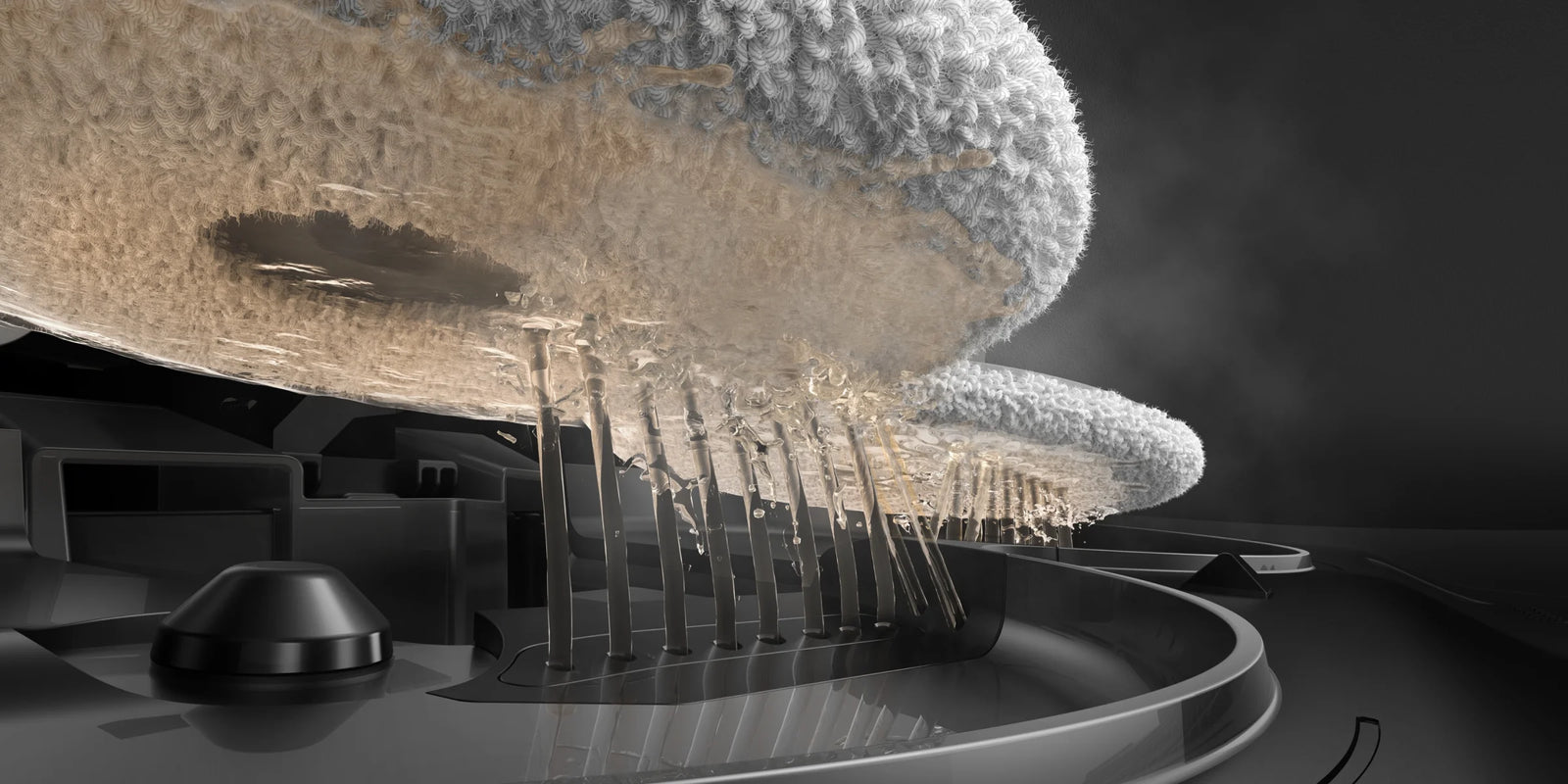Al aspirar, la tecnología TripleUp baja los cepillos laterales y el cepillo principal para capturar el polvo y el pelo de las mascotas, mientras que las mopas se elevan hasta 10,5 mm* para mantener las alfombras secas y sin daños. Esta configuración garantiza una gran potencia de succión y protege las alfombras de posibles daños por humedad.