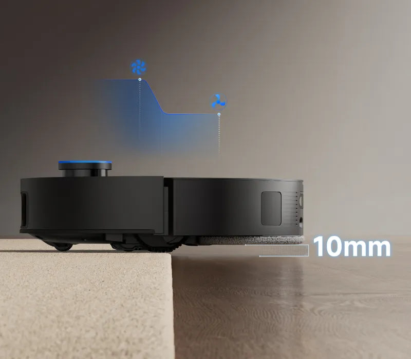 * 10,5 mm: según las pruebas realizadas en nuestro laboratorio interno. La diferencia de altura del robot aspirador es de 10,5 mm antes y después de levantar las mopas.