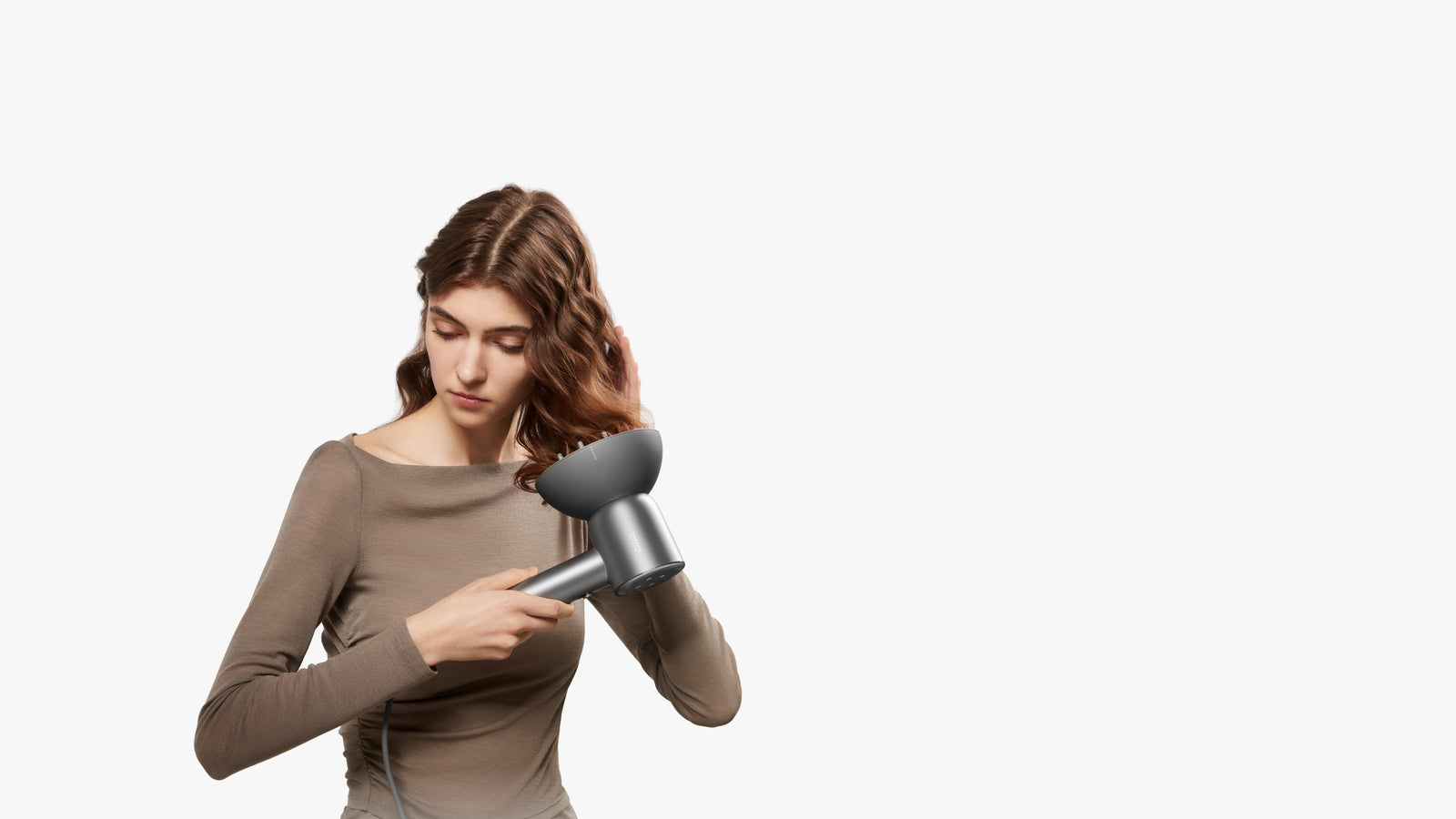 Conecta la boquilla difusora y coloca el cabello sobre su superficie para ayudar a conservar la forma natural de tus rizos.